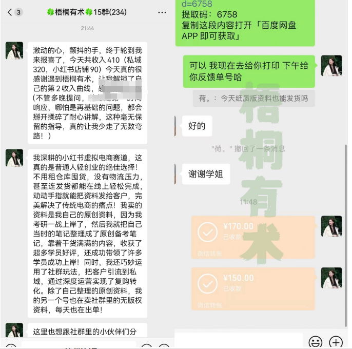 可以把资料保存到夸克、迅雷网盘里面,然后也是去小红书分享,建立群聊,有人需要就把链接发出去,有人转存、下载,充会员我们都有分成。