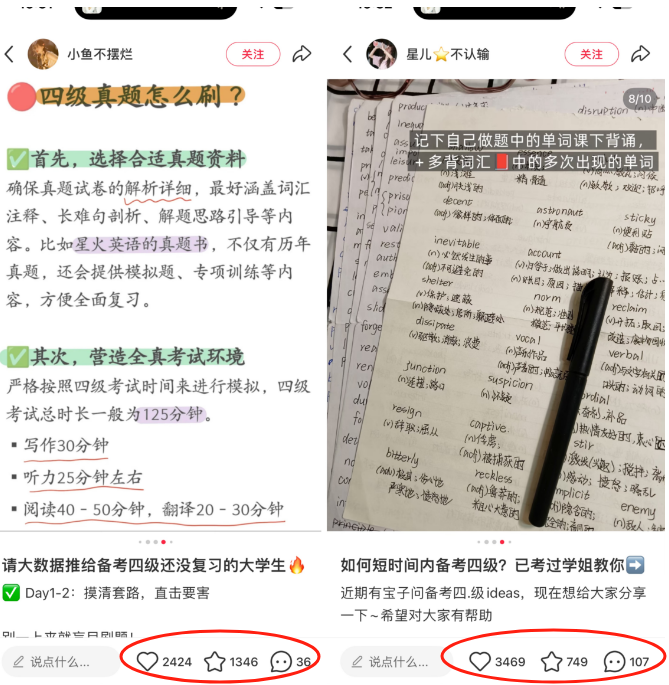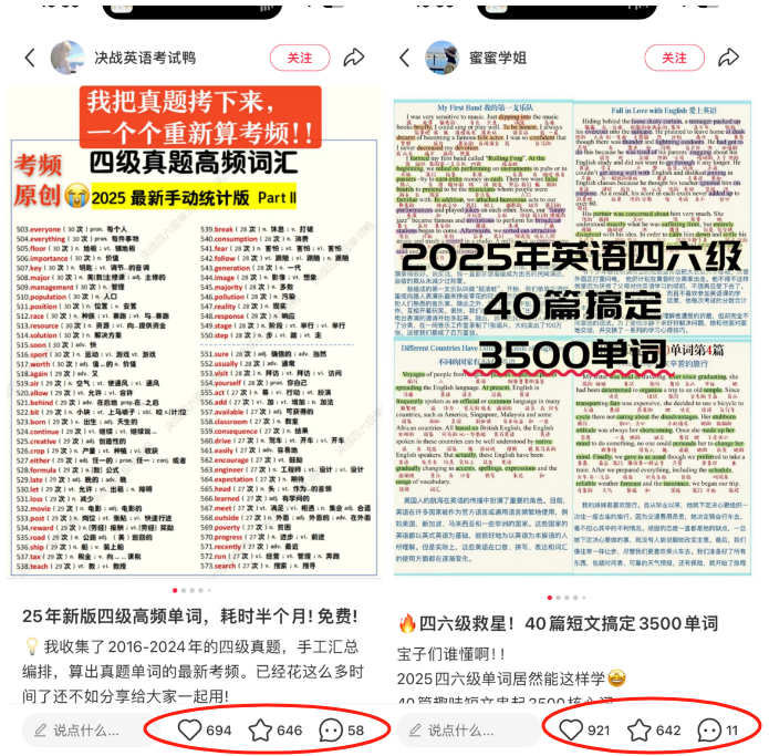 资料展示类:将整理好的资料以图片或文档截图的形式展示出来,标注清楚资料的特点和优势,如 “25年英语四六级40篇搞定3500单词”。同时,可以配上一段简短的文字介绍资料的获取方式,可以参考同行